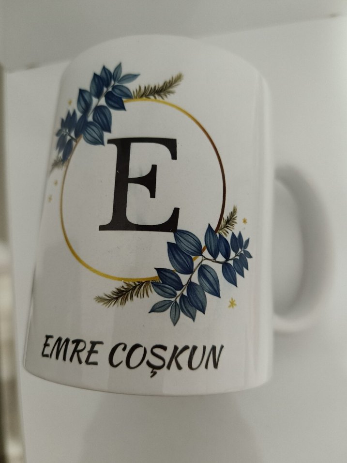 Beyaz kupa üzerinde büyük 'E' harfi, mavi çiçek desenleri ve Emre Coşkun ismi yer alıyor. ☕