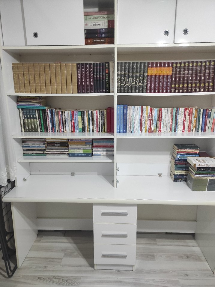 beyaz kitaplık ve çalışma masası, altında üç çekmeceli dolap bulunuyor. eni 1.76 yükseklik 2.25 masa derinliği 50 cm