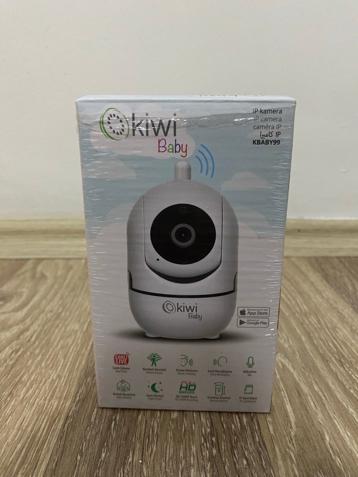 Beyaz Kiwi Baby kamera, HD net video ve mobil uygulama ile uzaktan izleme sağlar. Gece görüşü ve iki yönlü ses özelliği bulunur.