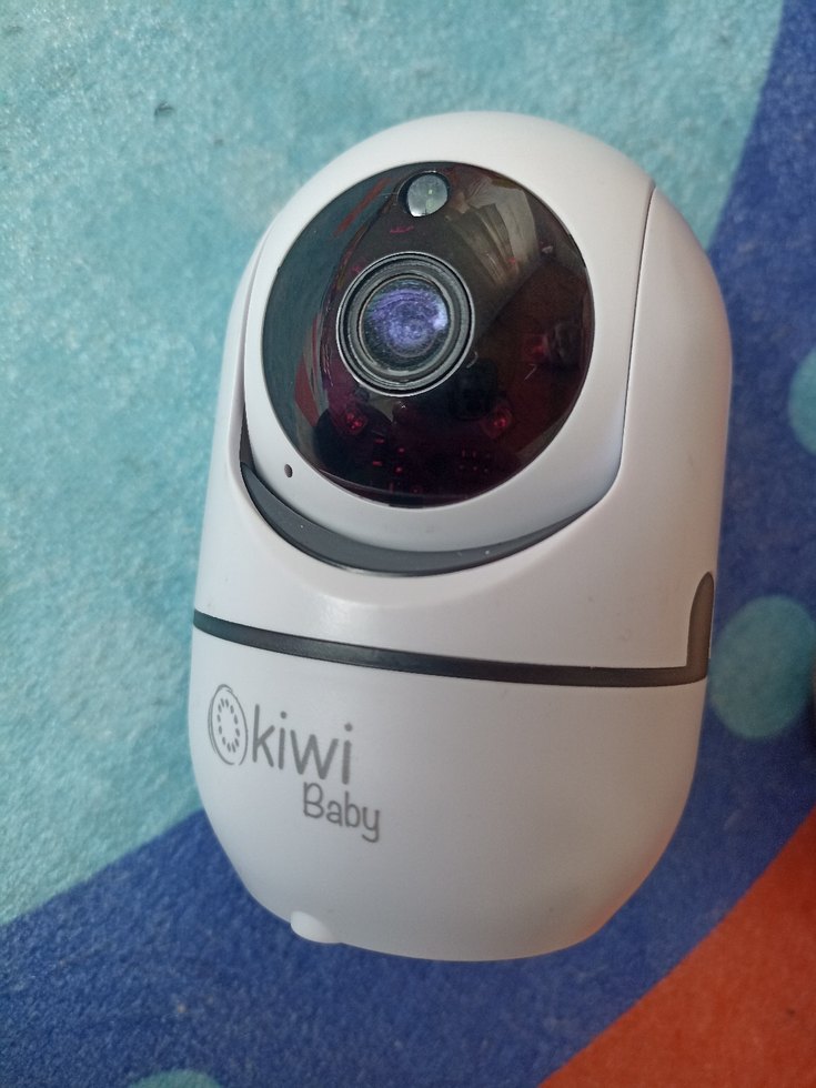 Beyaz renkte, kompakt tasarımlı Kiwi Baby bebek monitörü ve kamerası. Üzerinde 'kiwi Baby' yazısı bulunur.