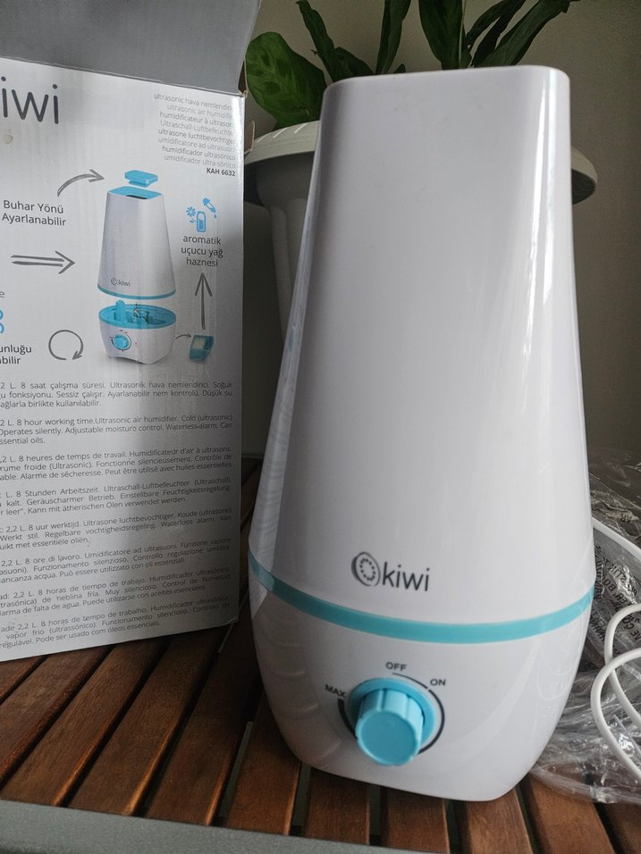 Beyaz renkli Kiwi hava temizleyici ve nemlendirici, ayarlanabilir mavi kontrol düğmesi ile kolay kullanım sağlar. Şık tasarımlıdır ve açık mavi ışık verir. ️