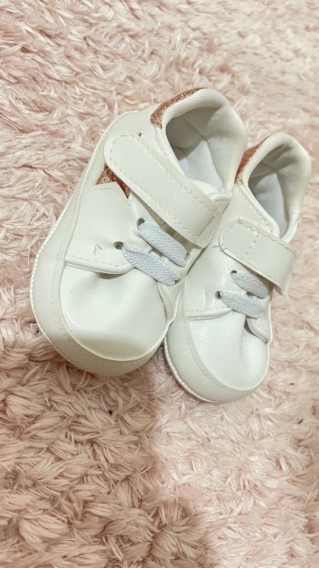 Beyaz, lastik tabanlı kız bebek ilk adım ayakkabısı. Velcro kapama ve sade, deseniz pastel sokak stili ile rahat kullanım sunar.