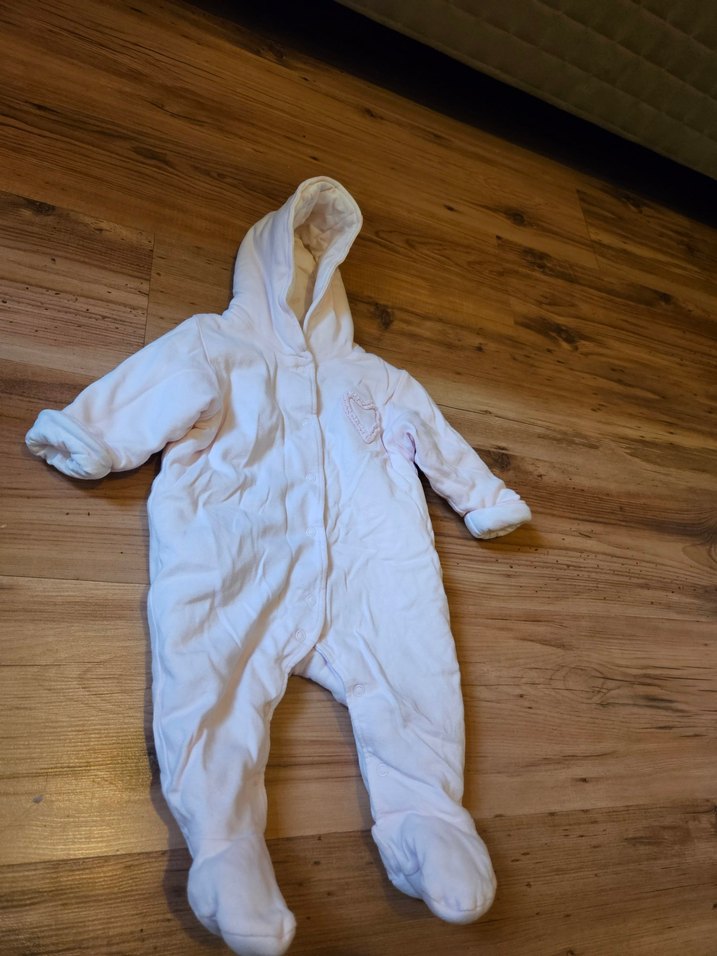Kapüşonlu, fermuarlı beyaz kız bebek tulumu, yumuşak ve sıcak kumaştan, çıtçıtlı yakaya sahip.