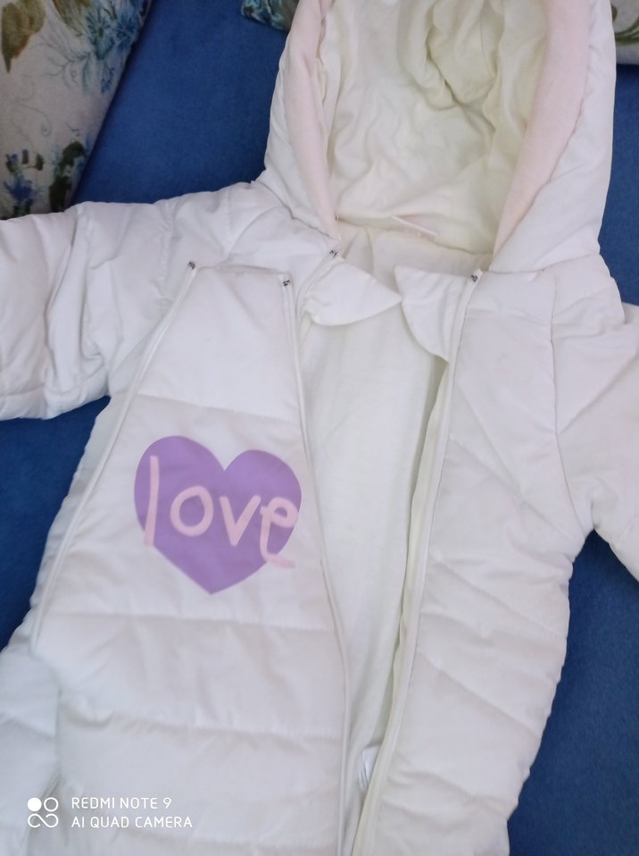 Beyaz kız bebek kar tulumu, notched lapel yakalı ve fermuarlı. Pastel renkli 'love' baskılı kalp deseniyle yumuşak bir görünüm sunar. ❄️