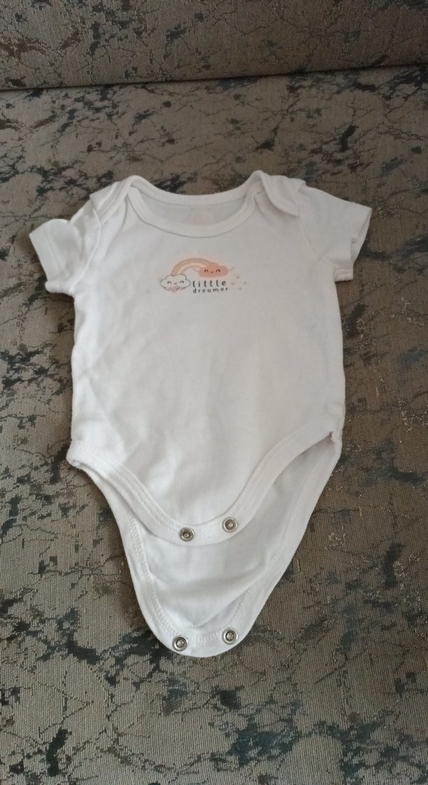 Beyaz renkli, kısa kollu kız bebek body, yuvarlak yaka ve çıtçıtlı kapanma özelliği ile kolay kullanım sağlar.
