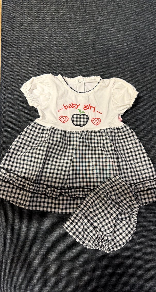 Pamuklu, kısa kollu, oturan kesim beyaz kız çocuk elbisesi. Renkli baskı ve fırfır detaylı, ekose desenli etek kısmı bulunur.