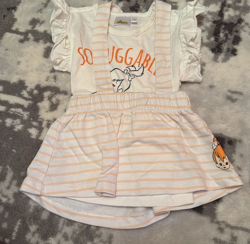 Beyaz kısa kollu, fırfırlı kollu üst ve pastel çizgili askılı etekli kız bebek takımı. Üstte "SOUGGABLE" yazılı renkli baskı bulunur.