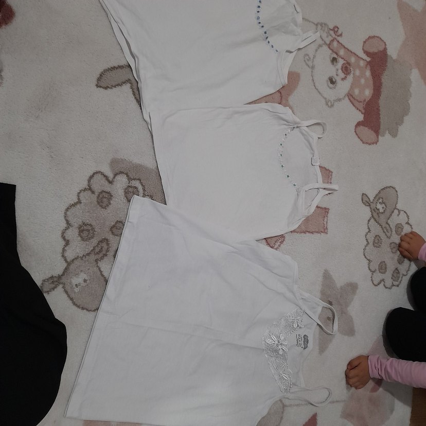 Beyaz, sade tasarımlı, ince kumaştan yapılmış üçlü kız çocuk atlet seti. Katmanlama için uygundur.