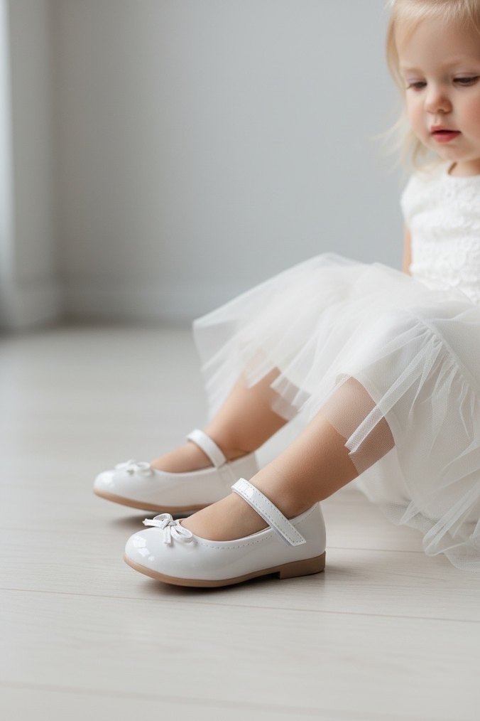 Modern klasik tarzda, beyaz renkli, yumuşak tabanlı kız çocuk babet ayakkabı, ön kısmında fiyonk detayı bulunur.