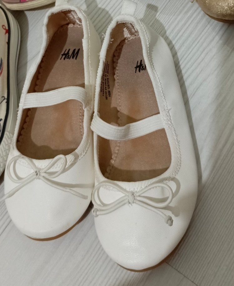 H&M beyaz kız çocuk babet ayakkabı, lastikli ve kauçuk tabanlı. Düz ve modern klasik tasarım.