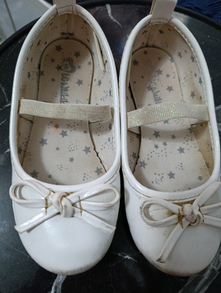 Parlak beyaz, tokalı bantlı, desensiz kız çocuk babet ayakkabısı, kauçuk malzemeden klasik şıklık sunar.