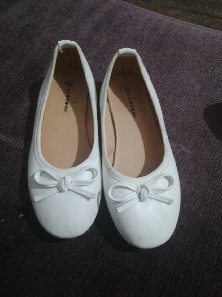 Beyaz renkli, küçük fiyonk detaylı kız çocuk babet ayakkabılar, dayanıklı kauçuk malzemeden yapılmıştır. Rahat ve günlük kullanıma uygundur.