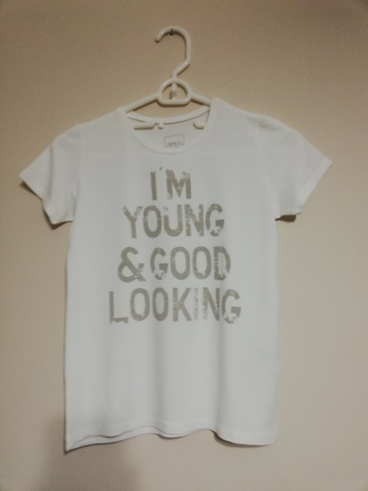 Pamuklu kumaştan yapılmış, kısa kollu ve yuvarlak yakalı beyaz kız çocuk tişörtü. Önünde gri renkli "I'M YOUNG & GOOD LOOKING" baskısı bulunur. Rahat kesim ve sokak tarzı için uygundur. Name it marka 9-10yaş kız çocuk esnek yumuşak tshirt. Sıfır yaka, standart boy, normal kesim. Az kullanılmıştır. Temiz ve çok iyi durumdadır.
