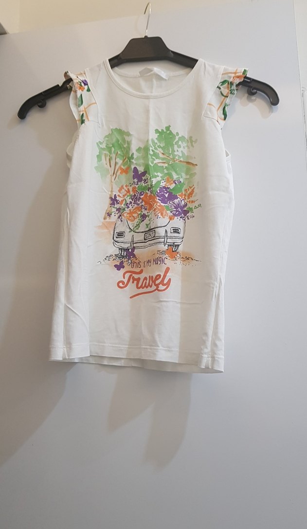 Pamuklu beyaz renkli kız çocuk tişörtü, kısa kollu ve yuvarlak yakalıdır. Pastel renkli baskıda araba ve çiçekler ile 'Travel' yazısı bulunur. Rahat ve salaş kesimlidir.