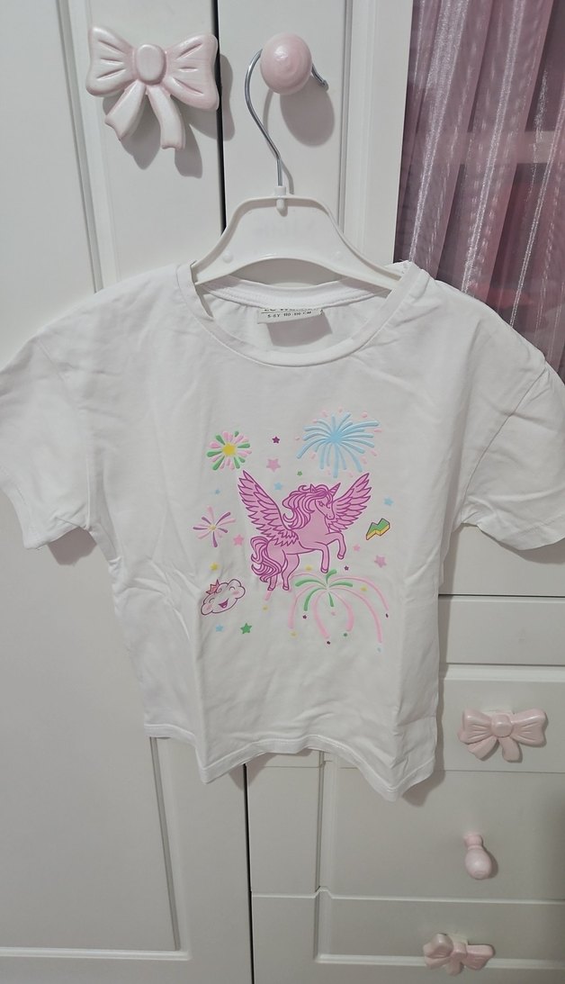 Beyaz renkli, pamuk kumaştan yapılmış, kısa kollu ve yuvarlak yakalı kız çocuk tişörtü. Pastel renkli kanatlı at ve havai fişek baskısı bulunur. Rahat kesimlidir.