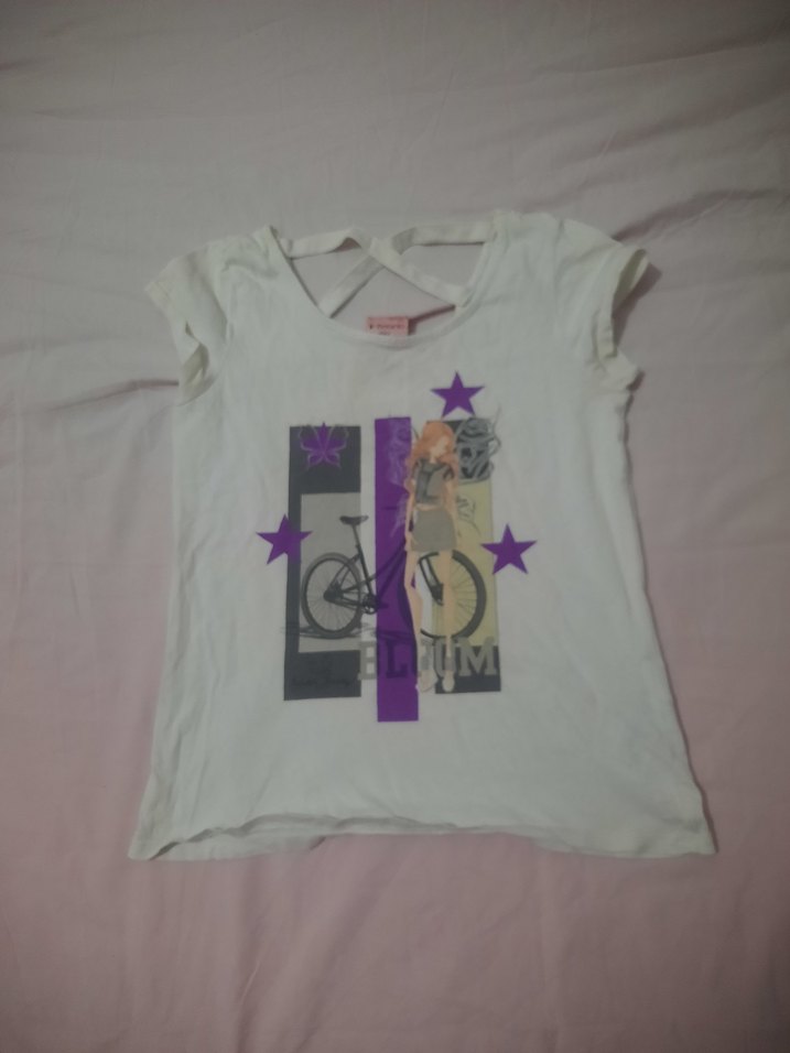 Beyaz, pamuklu, bol kesim kız çocuk tişörtü, kısa kollu ve ön kısmında baskılı desen, yuvarlak yaka.