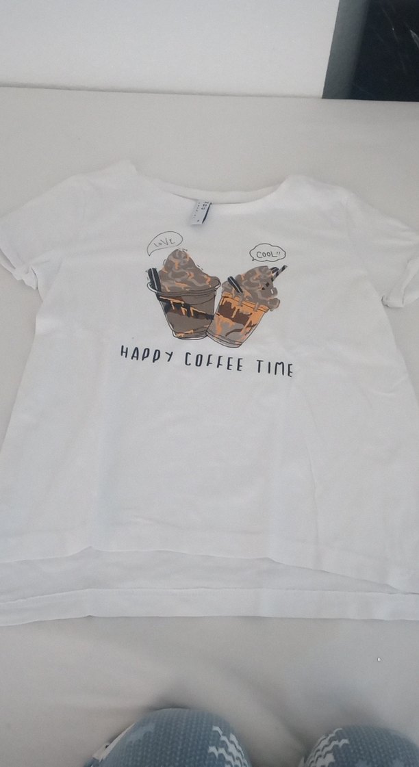 Pamuklu, beyaz renkli, kısa kollu kız çocuk tişörtü. Bol kesim ve yuvarlak yaka. Üzerinde kahve fincanları baskısı ve 'Happy Coffee Time' yazısı bulunur. ☕