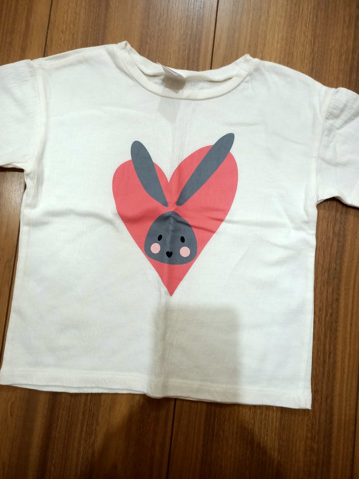 Yumuşak pamuklu, beyaz renkli kız çocuk tişört, kısa kollu ve yuvarlak yakalıdır. Kalp içinde tavşan baskısı vardır, rahat ve trend görünümlüdür.