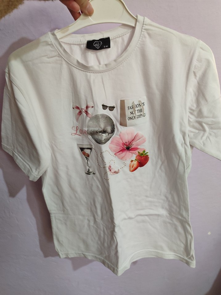 Beyaz pamuk kumaştan kız çocuk tişörtü, kısa kollu ve bol kesimdir. Bisiklet yaka ve sokak modasına uygun çeşitli renkli baskılar içerir.