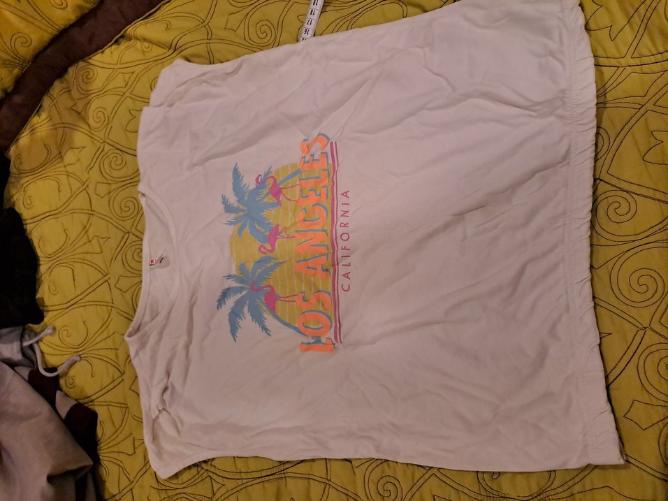 Pamuklu, kısa kollu ve loose fit beyaz tişört, Los Angeles temalı pastel baskılı desenle.
