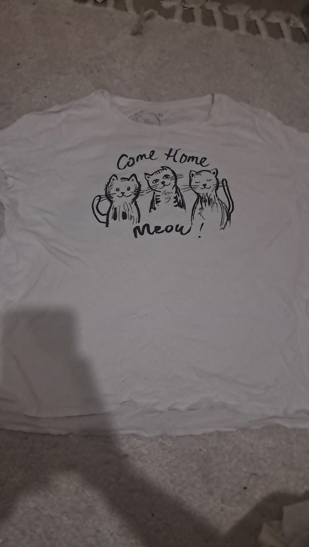 Pamuklu, beyaz renk, kısa kollu ve bol kesim kız çocuk tişörtü. Üzerinde "Come Home, meow" yazılı üç kedi baskısı bulunur.
