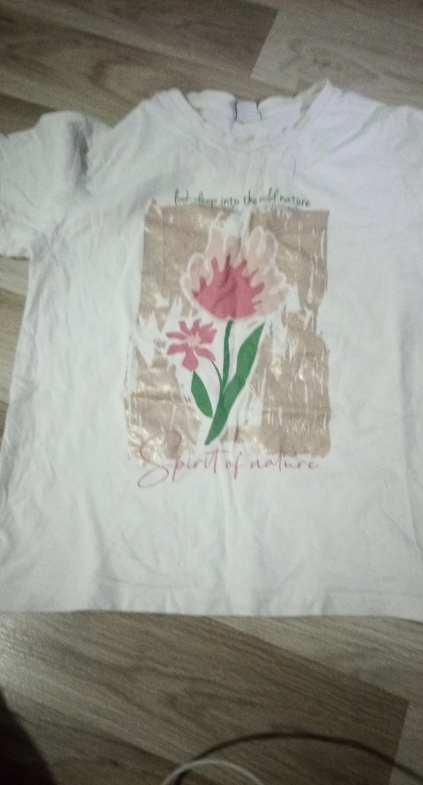 Beyaz pamuk kız çocuk tişörtü, kısa kollu ve bol kesim. Pastel renkli çiçek baskısı ve yuvarlak yaka. Bohem tarzda.