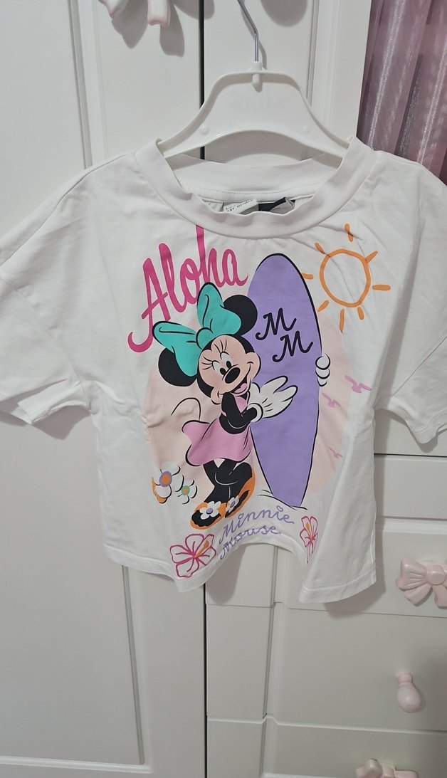 Pamuklu, beyaz renk, kısa kollu ve bol kesim kız çocuk tişörtü. Önünde Minnie Mouse ve 'Aloha' baskısı bulunur.