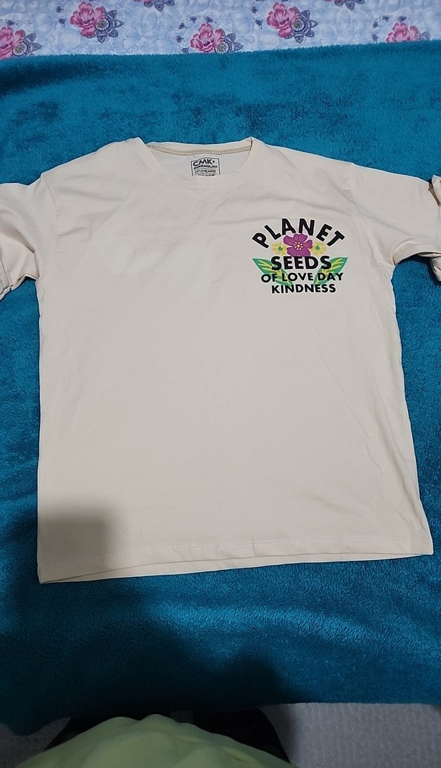 Beyaz, bol kesim, kısa kollu kız çocuk tişörtü, yuvarlak yaka ve KINDNESS, PLANET yazılı renkli baskı ile.