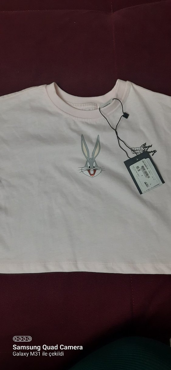 Beyaz renkli, yuvarlak yakalı ve kısa kollu kız çocuk tişörtü. Pamuk kumaştan, rahat kesimli ve pastel tonlarda Bugs Bunny baskılıdır.