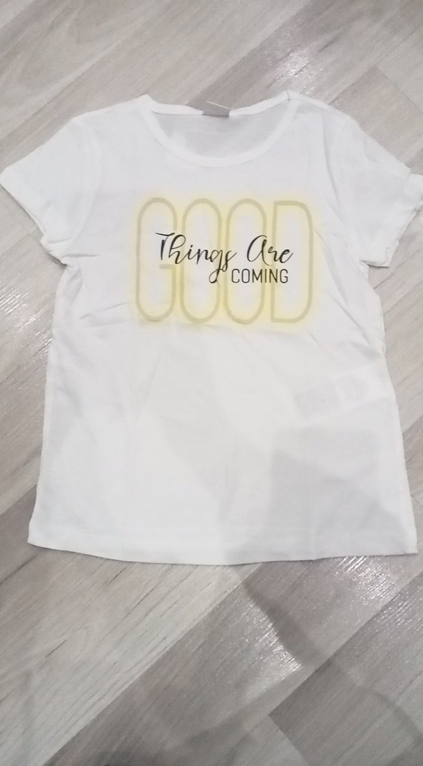 Pamuklu, beyaz renkli kız çocuk tişörtü. Kısa kollu, yuvarlak yakalı ve bol kesimdir. Üzerinde pastel tonlarda "Good Things Are Coming" baskısı bulunur.