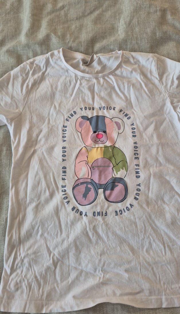 Pamuklu, beyaz renk, kısa kollu, bol kesim kız çocuk tişörtü. Renkli ayıcık baskısı ve "FIND YOUR VOICE" yazısı bulunur. Hiçbir kusuru,lekesi yoktur.Bavulda kırışmış..
