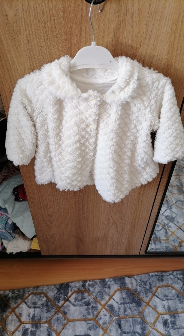 Beyaz kız çocuk bolero, uzun kollu ve yuvarlak yakalıdır. Bol kesimi ve parlak dokusu ile sade ve temel bir tarz sunar. ✨
