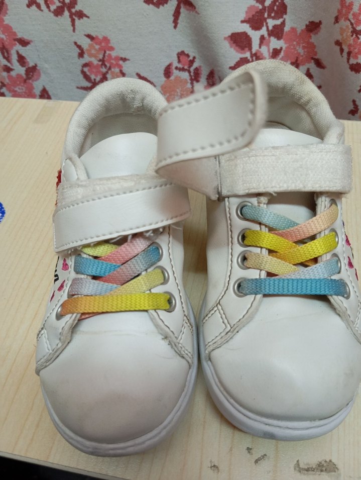 Beyaz spor ayakkabılar, cırt cırtlı kapanışa sahiptir. Kauçuk tabanlı, günlük ve sokak stiline uygundur.