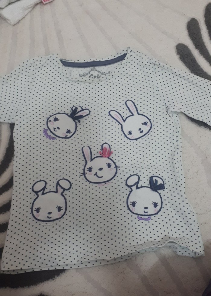 Pamuklu, beyaz, kısa kollu kız çocuk tişörtü. Düğmeli, baskılı sevimli tavşan figürleriyle, rahat ve şık bir sokak stili ürünü.