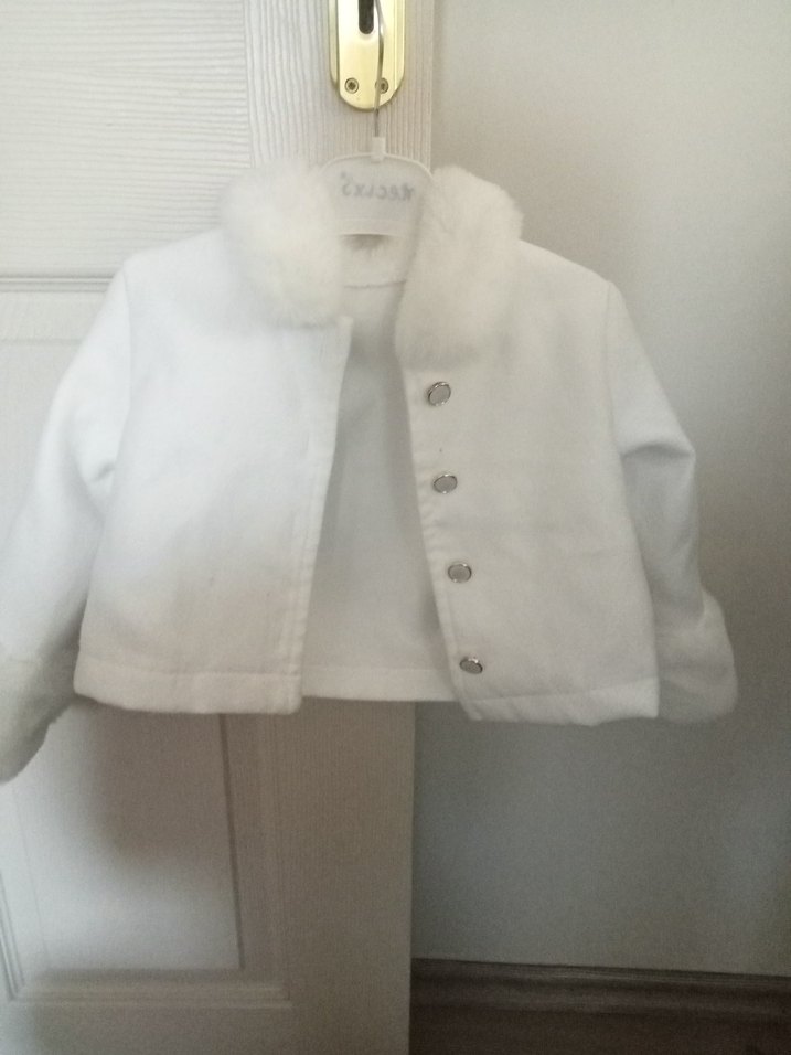 Beyaz kız çocuk bolero, düğmeli ve kesik yakalıdır. Uzun kollu ve rahat kesim olup, yumuşak ve sıcak kumaştan üretilmiştir.