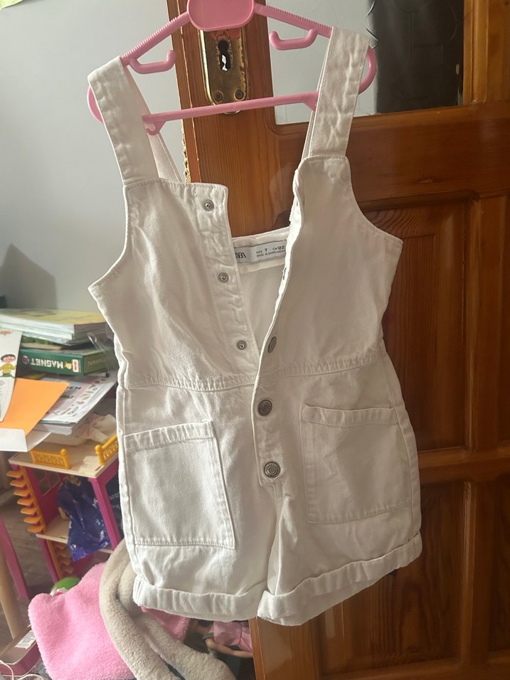Pamuklu kumaştan yapılmış, düğmeli ve cepli beyaz kız çocuk kısa tulumu, 7 yaş az kullanıldı