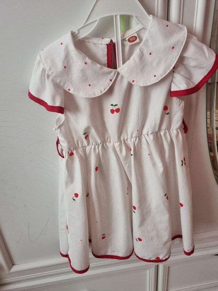 Pamuk beyaz kız çocuk elbisesi, kısa kollu ve fırfır detaylıdır. kiraz deseni ve yakalı, bol kesimdir. Kırmızı kenar süslemeleri vardır.