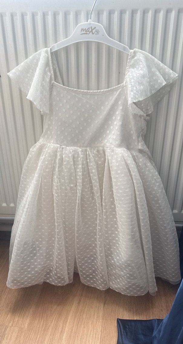 Beyaz kız çocuk elbise, ince askılı ve kare yaka. Hafif sentetik kumaştan, fırfır detaylı ve ince dokulu desene sahiptir. Bohem tarzda, rahat kesimdir.