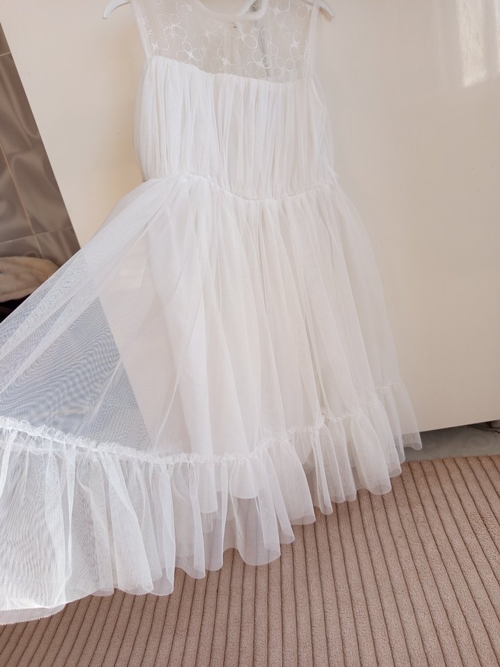Beyaz, askısız, bohem tarzda kız çocuk elbisesi. Fırfır detaylı ve bol kesim, hafif sentetik kumaştan yapılmıştır.