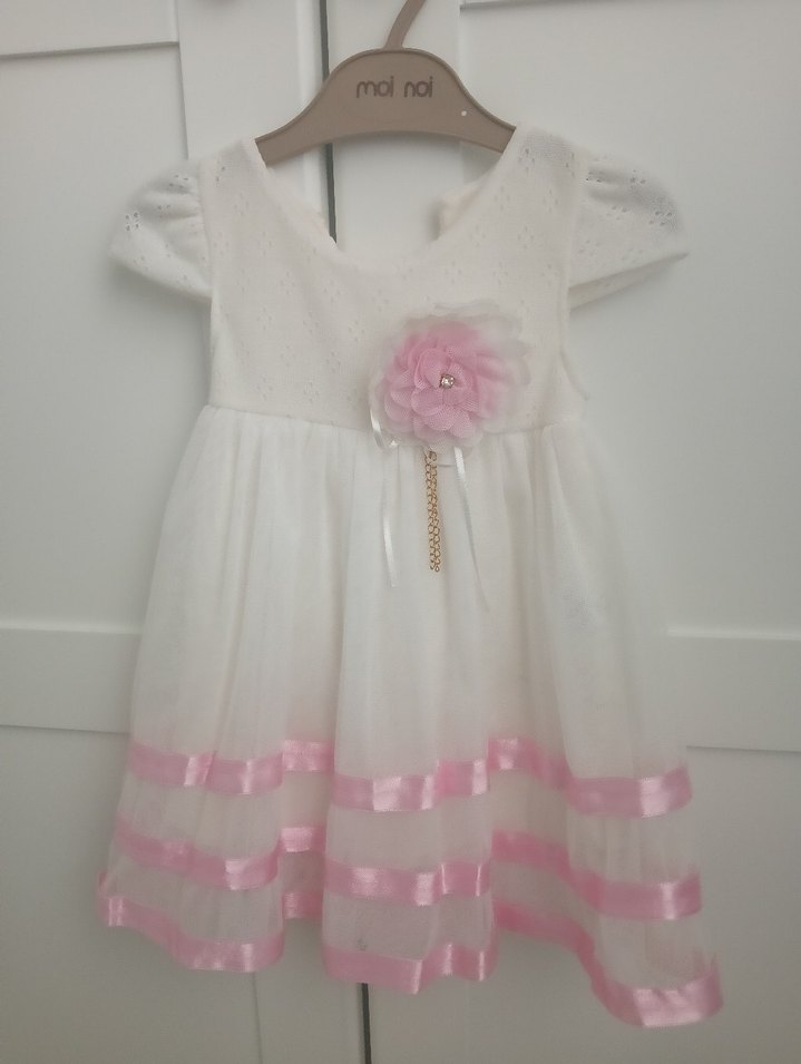Beyaz, ince askılı kız çocuk elbisesi, işlemeli detaylar ve pembe çiçek süsü içerir. Fırfırlı ve pastel pembe şeritlerle modern klasik tarzda.