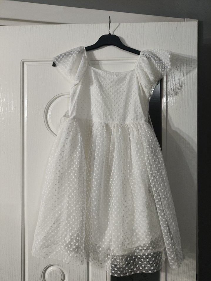 Beyaz renkli, ince sentetik kumaştan yapılmış kız çocuk elbisesi, fırfır detaylı ve askılı kolludur. Modern klasik tarzda, straplez yaka ve salaş kesime sahiptir.