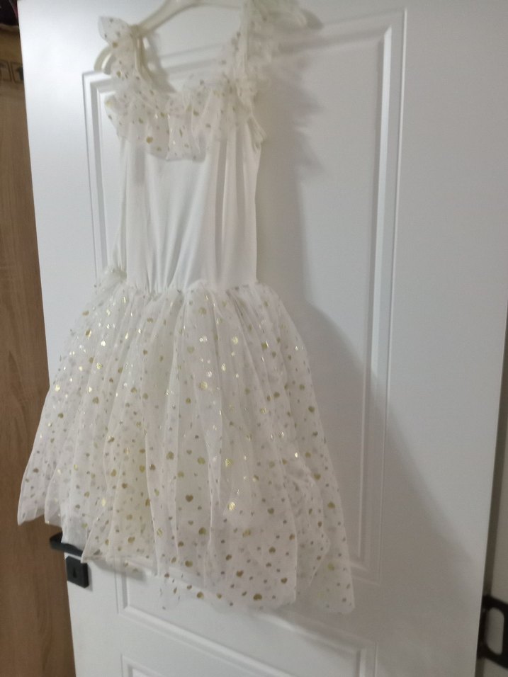 Kız çocukları için beyaz, straplez, fırfırlı ve dar kesim elbise. Hafif, desen içermeyen bohem tarzda, parlak detaylara sahip.