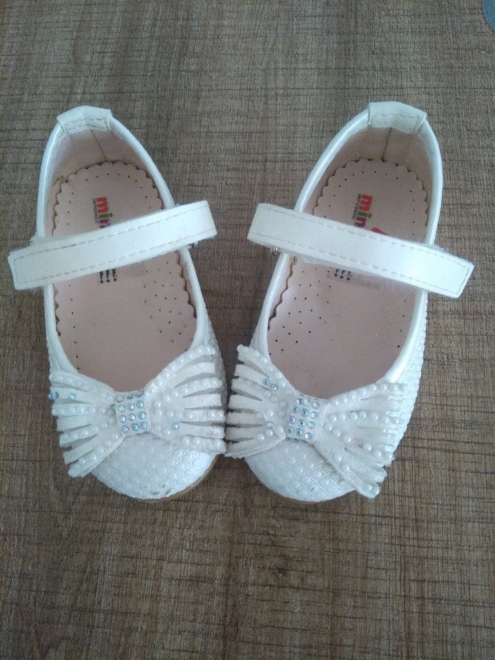 Beyaz kız çocuk babetleri, önünde fiyonk detayı bulunur. Üstte bantlı ve lastik malzemeden yapılmıştır.