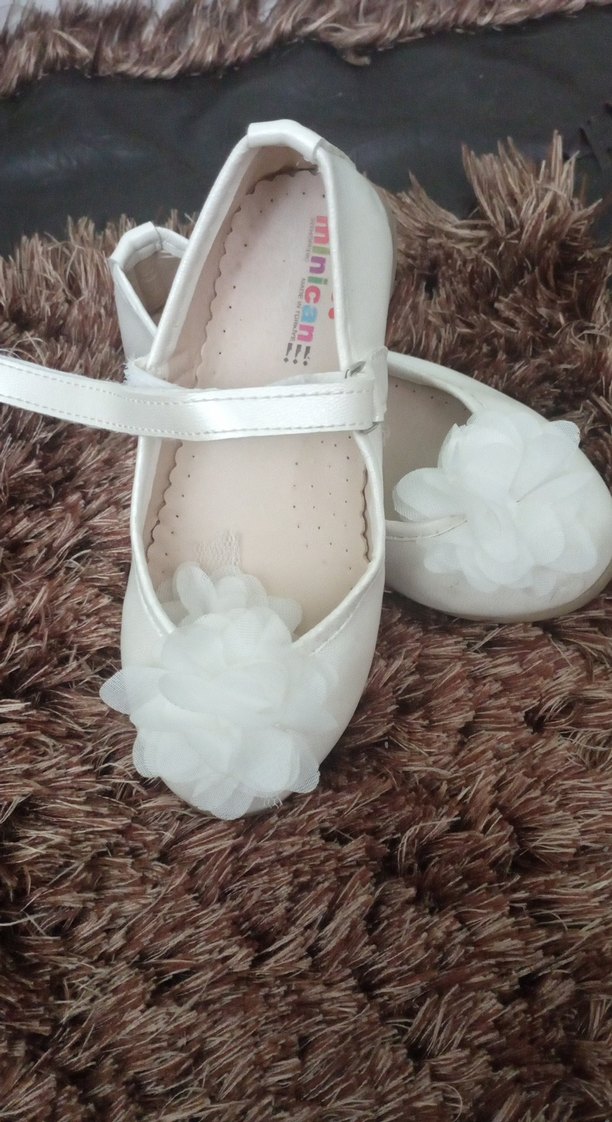 Beyaz kız çocuk babetleri, uç kısmında çiçekli fiyonklu detayla klasik tarzda, rahat kauçuk tabanlıdır.