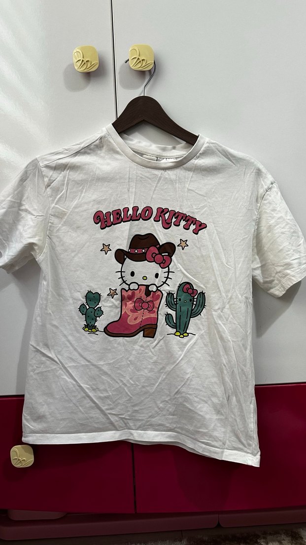 Ürünü hiç giymedim. Pamuklu beyaz kız çocuk tişört, kısa kollu ve normal kesim. Önünde Hello Kitty baskısı bulunur, rahat sokak stili için uygun.