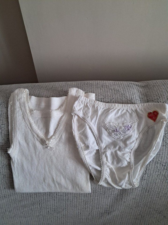 Dantel detaylı kolsuz beyaz üst ve nakışlı, küçük kalp işlemeli beyaz külot içeren çocuk iç çamaşırı takımı. Yumuşak ve rahat kumaş. ❤️ sıfırdır hiç kullanılmadı
