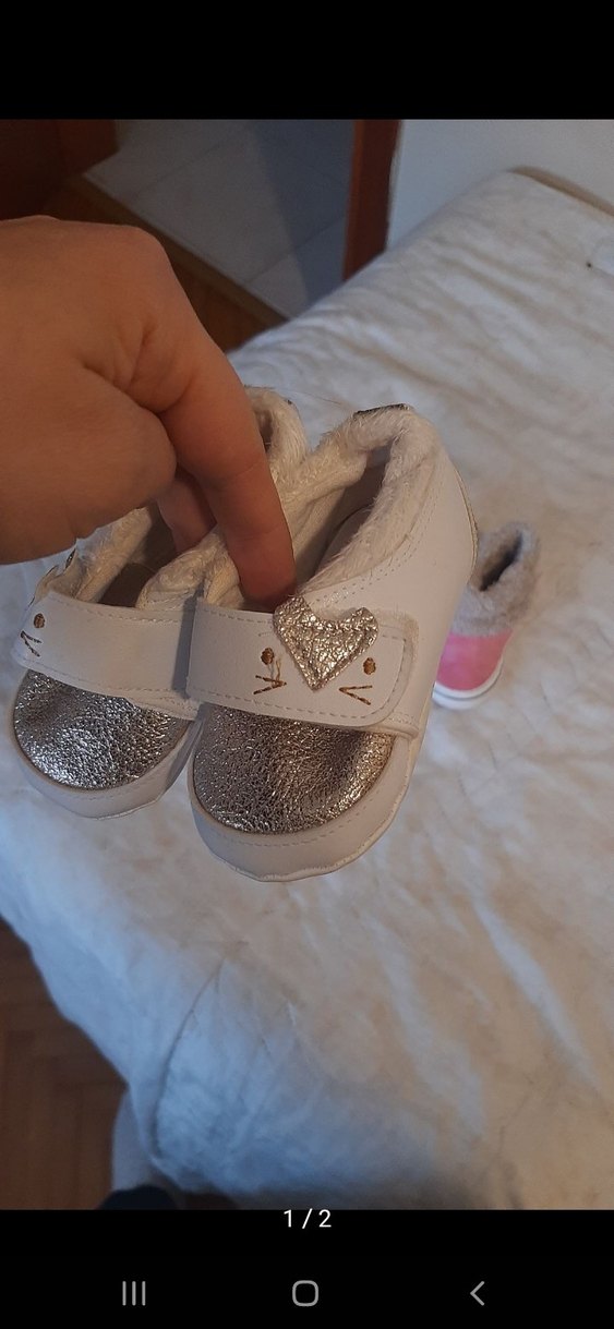 Beyaz kız çocuk ilk adım ayakkabısı, velcro bantlı ve kauçuk tabanlıdır. Trendy sokak stili için uygun, üzerinde gümüş kalp detayı bulunur.
