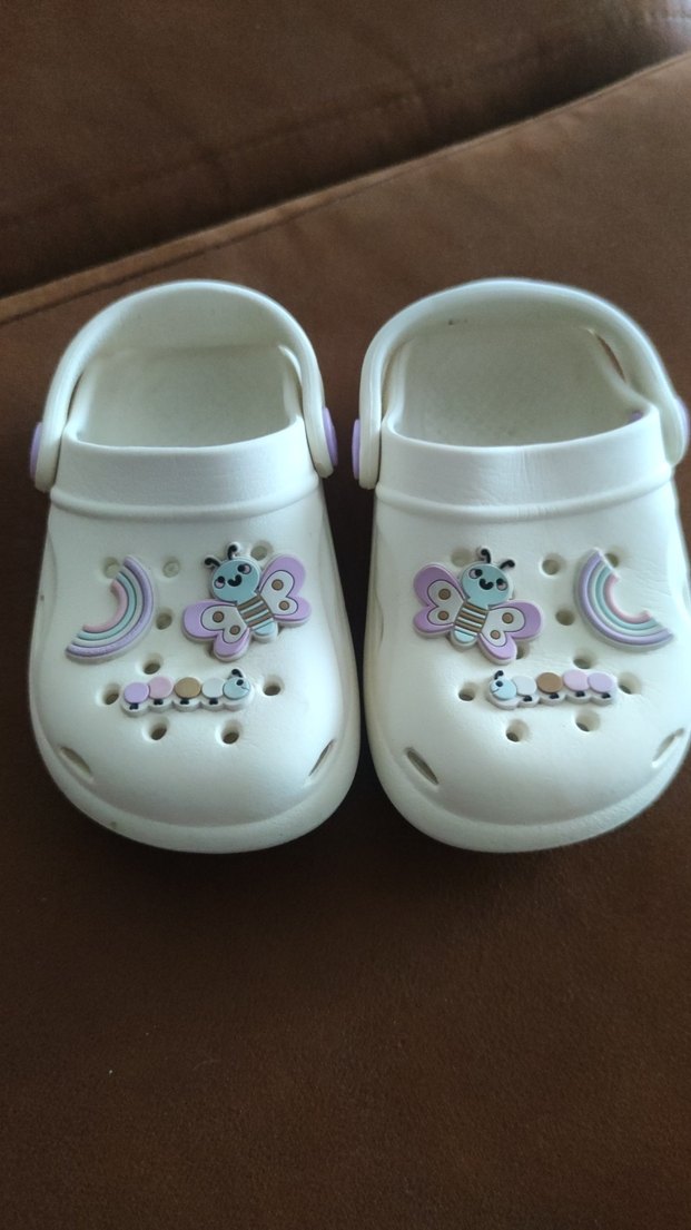 Beyaz kauçuk kız çocuk sandaletleri, kelebek ve gökkuşağı işlemeli pastel detaylarla, tokalı kayışlıdır.