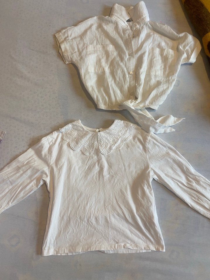 Keten kumaştan, kısa kollu, yakalı ve bol kesim beyaz kız çocuk gömleği, sade ve rahat bir tarz sunar.