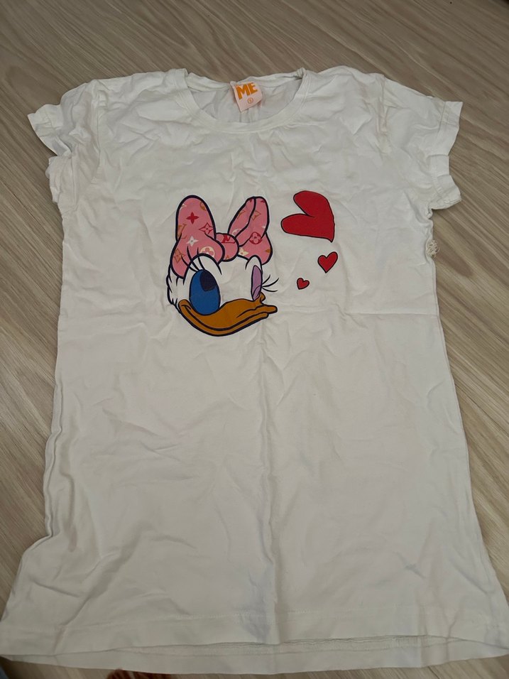 Pamuklu kumaştan, rahat kesimli beyaz kız çocuk kısa kollu tişört, önünde renkli baskı deseni bulunur. 3 tane